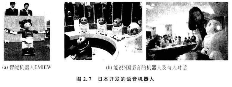 日本日立公司也研制了一臺(tái)智能機(jī)器人EMIEW, 它的個(gè)頭和小孩一樣,依靠輪子移 動(dòng),如圖2.7(a)所示。由于身上裝有數(shù)碼相機(jī)和雷達(dá)探測(cè)器,它可以自動(dòng)地躲避障礙物。 同時(shí)它的詞匯儲(chǔ)備量達(dá)到100多個(gè),能夠?qū)σ恍┖?jiǎn)單的聲音指令做出反應(yīng),并且還能夠 和人進(jìn)行簡(jiǎn)單的對(duì)話交流,甚至播報(bào)天氣預(yù)報(bào)等。第二代 EMIEW2 機(jī)器人可以通過無 線電裝置接收指令,然后毫不費(fèi)力地在辦公室之間來回奔波,為辦公室人員跑腿。它站 立時(shí)身高大約為31.5英寸,體重為29磅。它能夠?qū)φ系K物應(yīng)付自如,對(duì)人的語音做出 回應(yīng),并且一次充電后即可工作1小時(shí)。此外,能說5國語言的機(jī)器人及與人對(duì)話的機(jī) 器人也已經(jīng)誕生了,如圖2.7(b) 所示。在我國舉辦的日語演講大賽現(xiàn)場(chǎng)上,參加比賽的 選手以及日語院校的學(xué)生不但與該機(jī)器人進(jìn)行了交流互動(dòng),而且該機(jī)器人還獻(xiàn)上了許多 精彩舞蹈和歌曲。