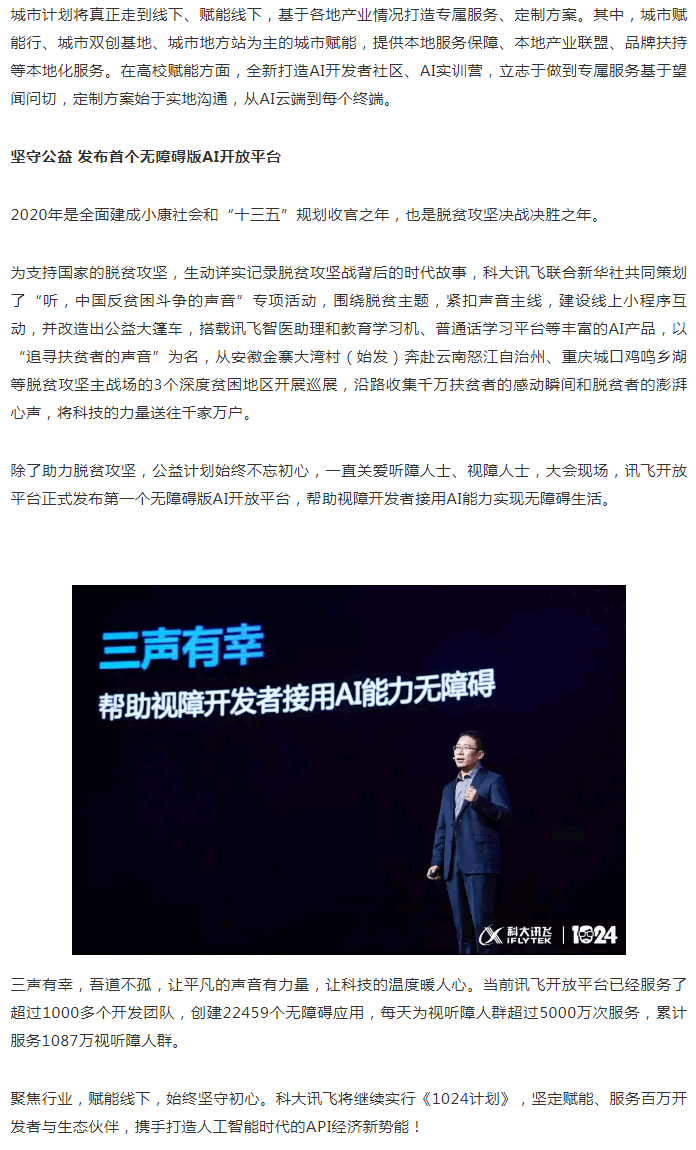 科大訊飛1024計劃全新升級為“AI賦能計劃”,發(fā)布聚焦行業(yè)的先導計劃、賦能線(xiàn)下的城市計劃、堅守初心的公益計劃!拔覀儗漠a(chǎn)品賦能走向行業(yè)賦能,實(shí)現進(jìn)階服務(wù),為生態(tài)和應用的發(fā)展提供更契合的A.I.源動(dòng)力! 胡國平表示。