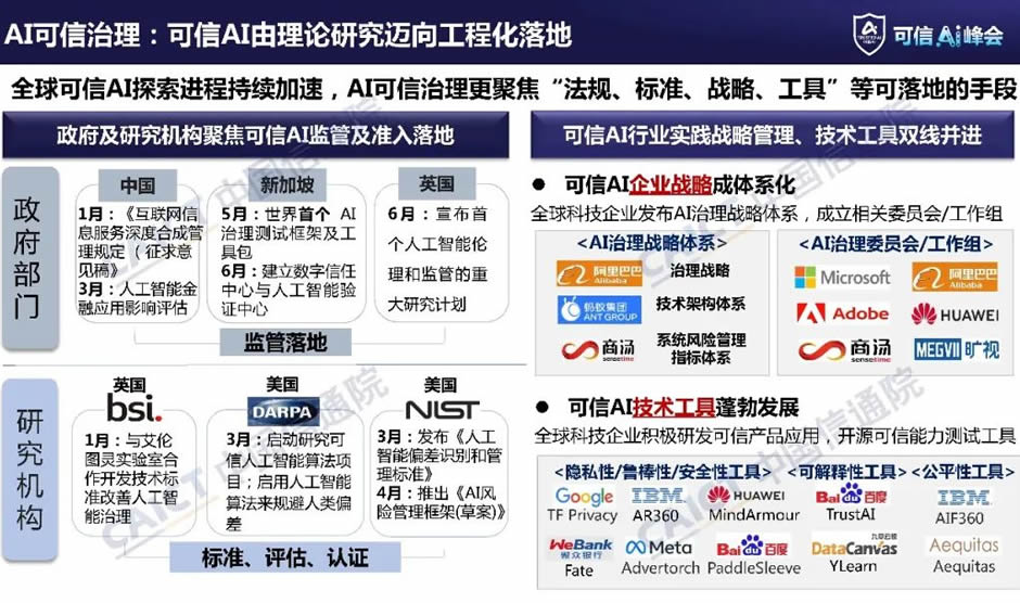可信AI由理論研究邁向工程化落地。隨著人工智能技術(shù)的快速發(fā)展,社會(huì)各界對(duì)可信AI研究已經(jīng)從理論探索逐步走向工程化落地實(shí)踐。政府與研究機(jī)構(gòu)相關(guān)政策和規(guī)范從宏觀指導(dǎo),開始向可操作、可落地的規(guī)范演進(jìn)。在法律監(jiān)管層面,各政府部門的法規(guī)政策愈發(fā)重視實(shí)施和操作。例如新加坡于5月出臺(tái)世界AI治理測(cè)試框架及工具包;英國(guó)6月宣布人工智能倫理和監(jiān)管的重大研究計(jì)劃。