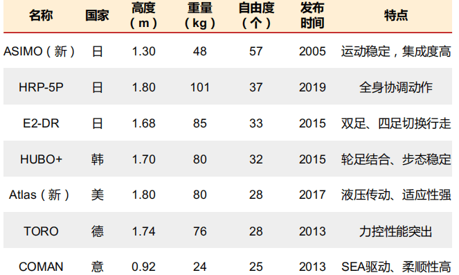 群雄并起,逐鹿人形機器人。日韓在人形機器人L域布局早,研究表現活躍;美國在人形機器人L域后來(lái)居上。波士頓動(dòng)力研發(fā)的代表產(chǎn)品Atlas身G1.8m,體重80kg,具有28個(gè)關(guān)節,可完成原地起跳轉身一周等流暢、G難度的“跑酷”動(dòng)作,但主