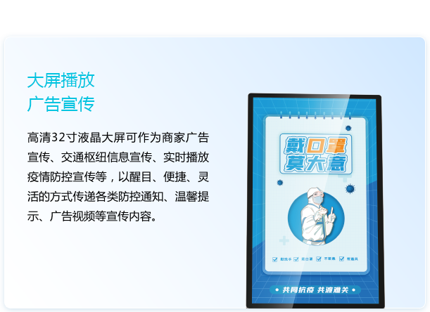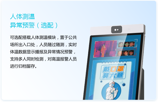 32寸主屏搭載可定制化模塊,提供迎賓接待、業(yè)務(wù)咨詢(xún)、體溫監測等特色服務(wù)的智能大屏機器人?蓪(shí)現接待講解、引導跟隨、宣傳巡邏等功能,還可提供人臉識別、二維碼掃描、身份證讀取、叫號、打印等特色服務(wù)。